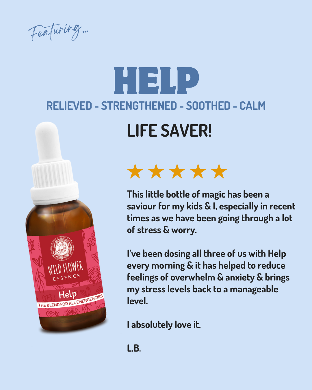 💜 Help Blend – Your go-to for all the big emotions: fear, worry, shock, sadness, grief. Perfect after tantrums, nightmares, or any kind of distress. The "everything is terrible" rescue remedy.