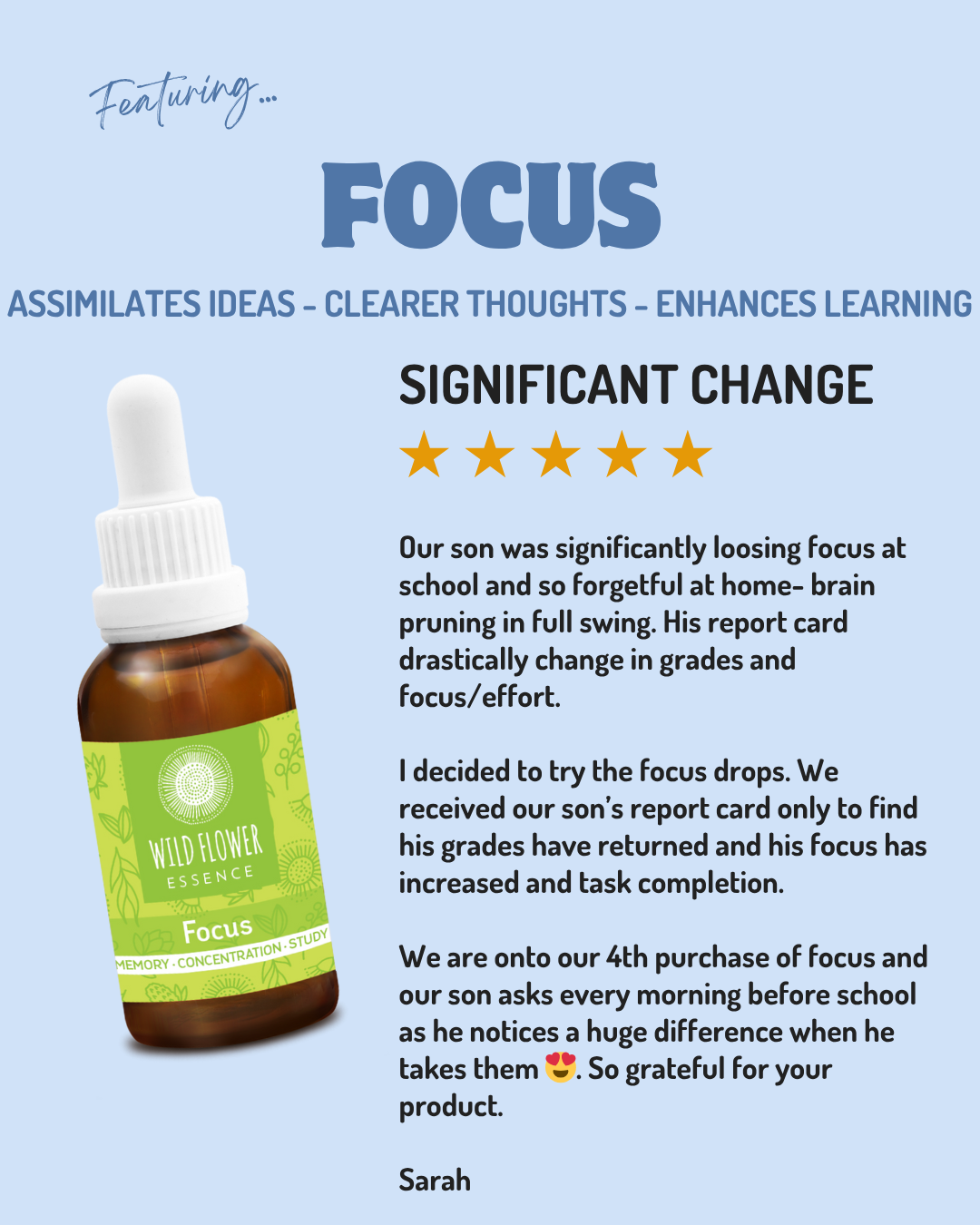 🧠 Focus Blend – Clearer thoughts for work, school, reading, studying, or anything requiring full attention. Pop it in the water bottle for the school or work day. Game changer.